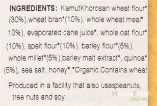 Ingredients: KAMUT® khorasan wheat flour*, wheat bran*, whole wheat meal*, cane sugar*, whole oat flour*, spelt flour*, barley flour*, whole millet*, barley malt extract*, quinoa*, sea salt, honey*.