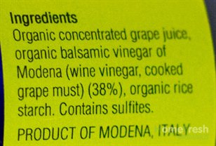 Ingredients: Organic concentrated grape juice, Organic Balsamic vinegar of Modena (wine vinegar, cooked grape must) (38%), Organic rice starch.