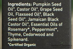 Ingredients: Pumpkin Seed Oil*, Castor Oil*, Grapeseed Oil, Jamaican Black Castor Oil*, Black Seed Oil, Essential Oils of Rosemary*, Peppermint*, Thyme, Cedarwood and Spikenard. *Certified Organic