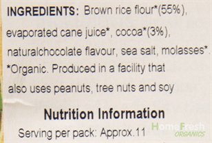 Ingredients: Brown rice flour*, cane sugar*, cocoa*, natural flavor, sea salt, molasses*.